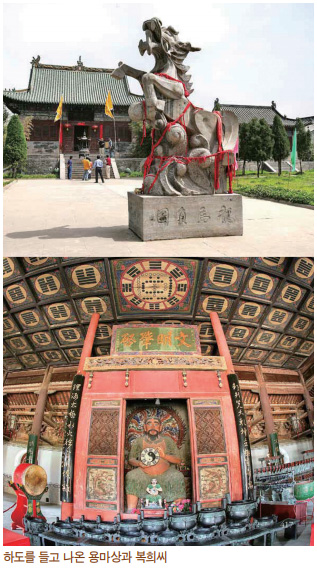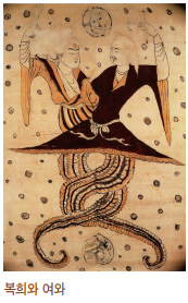 복희와 여와는 인류 문명의 시조로 나오는데, 이들을 주제로 한 그림을 보면, 사람 얼굴에 뱀의 몸을 하고 있다고 알려져 있습니다. 이른바 인두사신人頭蛇身이죠. 각각 손에는 창조와 문명의 상징물인 구부러진 자[曲尺]과 컴퍼스를 들고 있고, 뱀의 몸은 용을 상징한다고 볼 수 있으며 세상의 조화와 만물의 생성이 초래됨을 나타낸다고 합니다.
