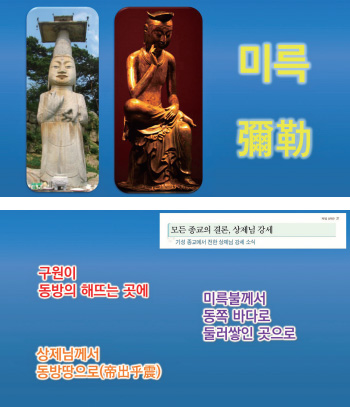 불교 쪽에서는 미륵불께서 동쪽 바다로 둘러싸인 곳으로 오신다고 합니다. 저는 미륵은 특징이 두 가지라고 말씀을 드리고 싶어요. 하나는 인간을 건지기 위해 참 많은 고뇌에 잠겨 있는 싱킹 붓다(Thinking Buddha)죠. 또 한 가지는 이렇게 서 있으면서 머리에 관을 쓰고 계세요. 우주를 통치하시는 하나님의 모습을 가지고 있어요.
