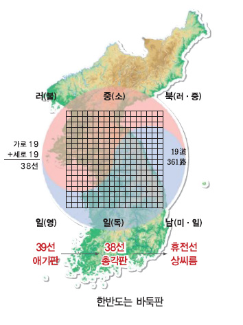 앞에서 오선위기 바둑판의 이치를 설명하였는데, 이제부터는 다섯 신선 가운데 주인인 우리나라에서 벌어지는 각축 과정을 정리하고 있습니다. 그 동선動線이 시간 순으로 되어 있지 않아서 약간의 혼란이 올 수 있는데 이 역시 의도된 것이라고 봅니다. 결론은 오선위기 모두 우리나라를 중심으로 전개된다는 사실입니다. 상씨름 곧 상투 튼 주인들끼리 맞짱 뜨는 대판씨름으로 마무리된다는 것이지요.