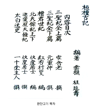 『환단고기』는 안함로의 『삼성기 상』, 원동중의 『삼성기 하』, 행촌 이암의 『단군세기』, 범장의 『북부여기』, 일십당 이맥의 『태백일사』, 이 다섯 종의 책을 한 권으로 엮은 책이다. 신라 고승高僧 안함로에서 조선조 이맥에 이르기까지 거의 천 년 세월에 걸쳐 다섯 사람이 저술한 사서가 하나의 책으로 묶여진 것이다.